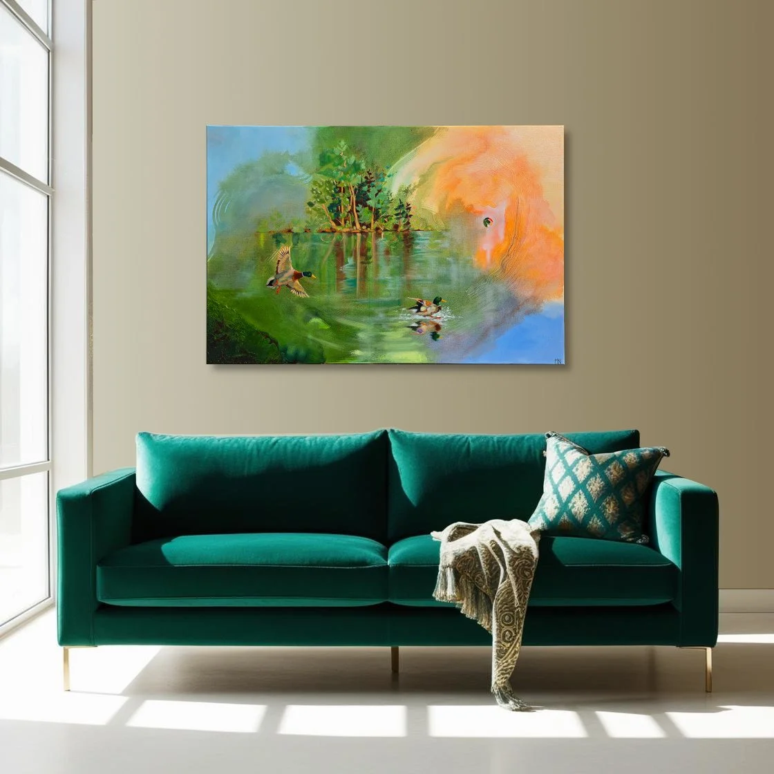 Der Flug eines Erpels, der elegant auf einem See landet, zieht die Blicke des Betrachters magisch an. Im Moment des Anflugs und der sanften Landung spiegelt sich nicht nur die Landschaft im Wasser, sondern auch die innere Ruhe, die entsteht, wenn wir in unserem Rückzugsort angekommen sind. Die sanften Grün- und Orangetöne fließen ineinander, verschwimmen an den Rändern – so wie der Moment, in dem wir uns von äußeren Erwartungen lösen und Zuhause entspannen.