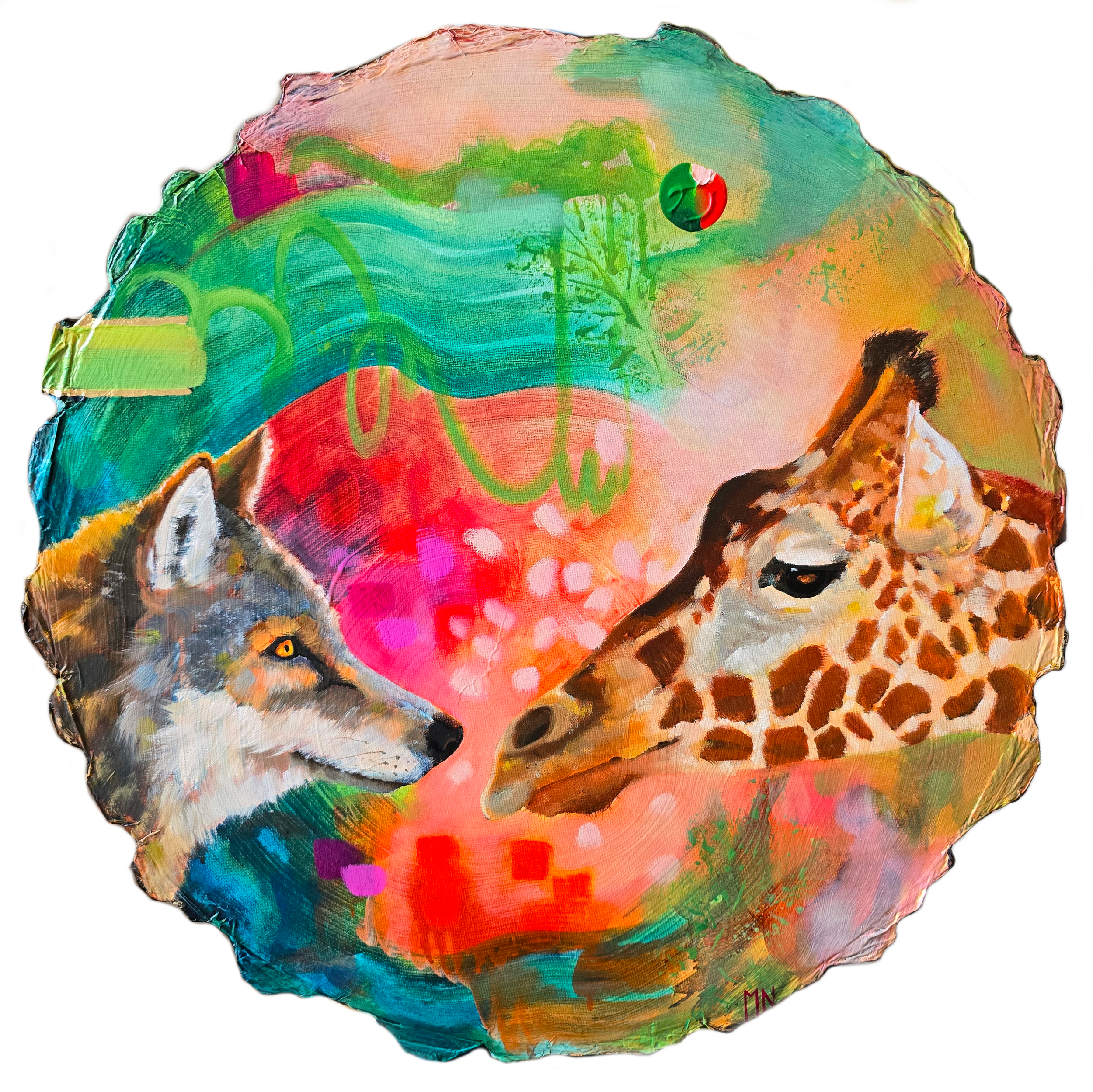 Ein Wolf und eine Giraffe. Zwei Gegensätze und doch eins in ihrem Blick. Ihre Augen spiegeln sich, eine Begegnung in völliger Präsenz. Kein Urteil, keine Ablenkung – nur ein stilles, tiefes Verständnis.